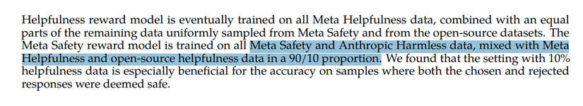- Retaining 90% of Anthropic's harmlessness data mixed with 10% from Meta wasn't explained. Why only 10% from Meta? Could it be to develop a stronger model?