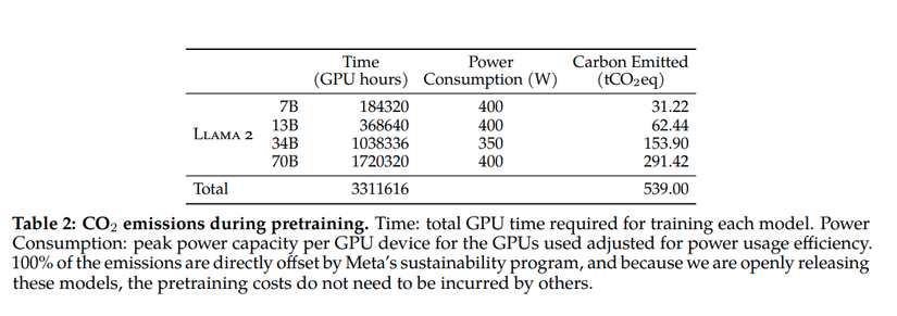 This is also the first paper discussing the power consumption and carbon emissions for training. It consumed approximately 3.3 million GPU hours, equating to about 1.3 million KW of power and releasing 539 tons of CO2 into the atmosphere. This is a figure worth noting.