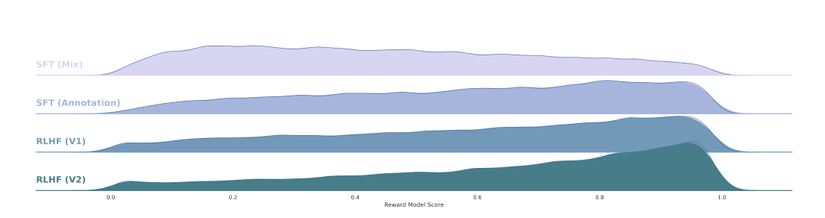 During tuning, the reward model continuously updates with new data. Before discussing the reward model training process, let's explore how they constructed the dataset. RLHF brings the model closer to real-world distributions. Onscreen, one can notice the distribution shift from models trained with Supervised Fine-tuning to the RLHF distribution. The RLHF distribution appears more human-like.